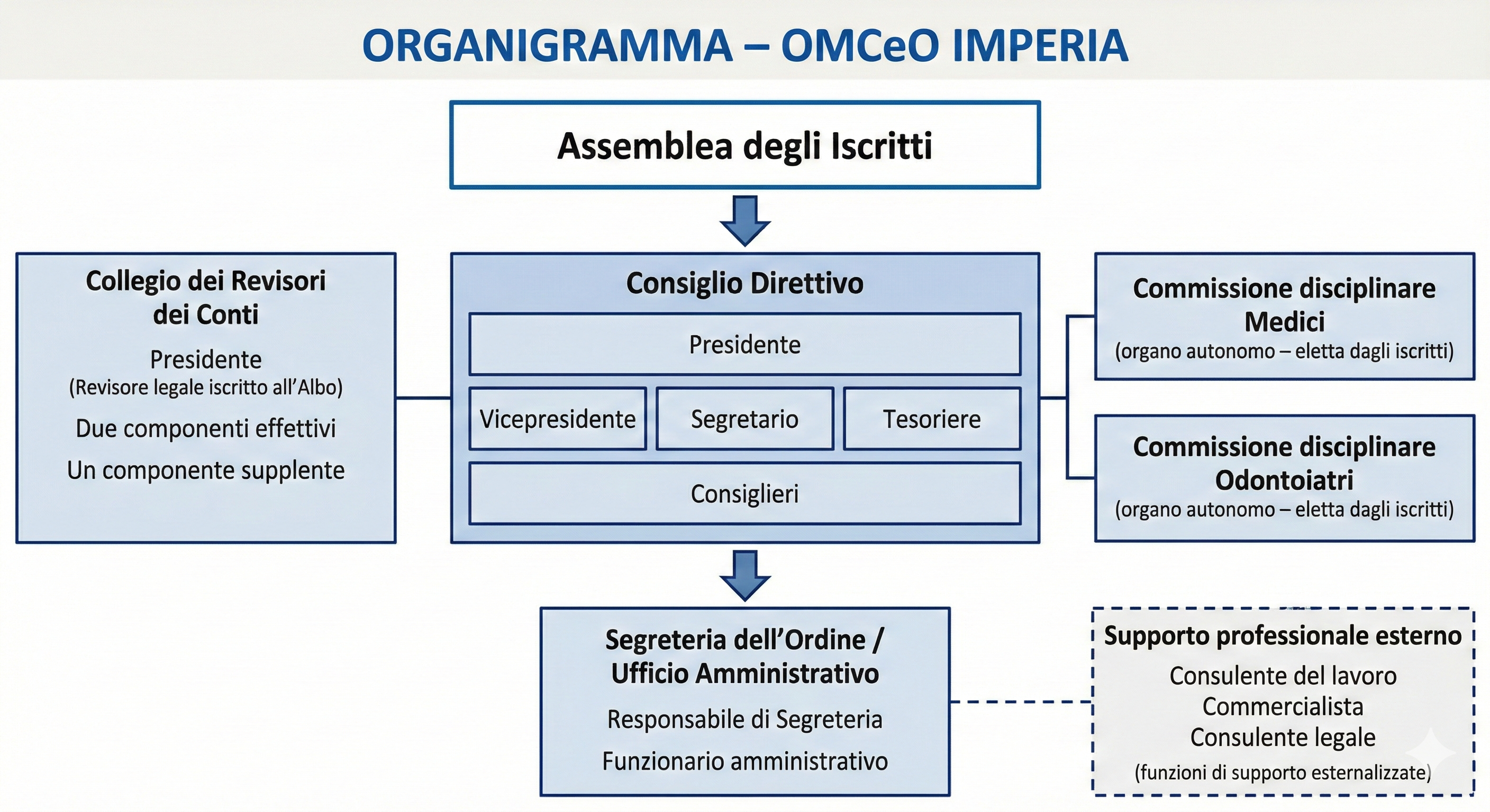 L’organizzazione dell’Ordine dei Medici Chirurghi e degli Odontoiatri della Provincia di Imperia è strutturata in modo coerente con le dimensioni e le funzioni istituzionali dell’ente.